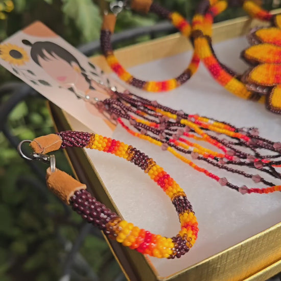 1 sunflower beaded medallion, medallion oendant measures 4.5x4.5 inches, rope measures 23in he's one side, 46 inches combined. Backed with leather.